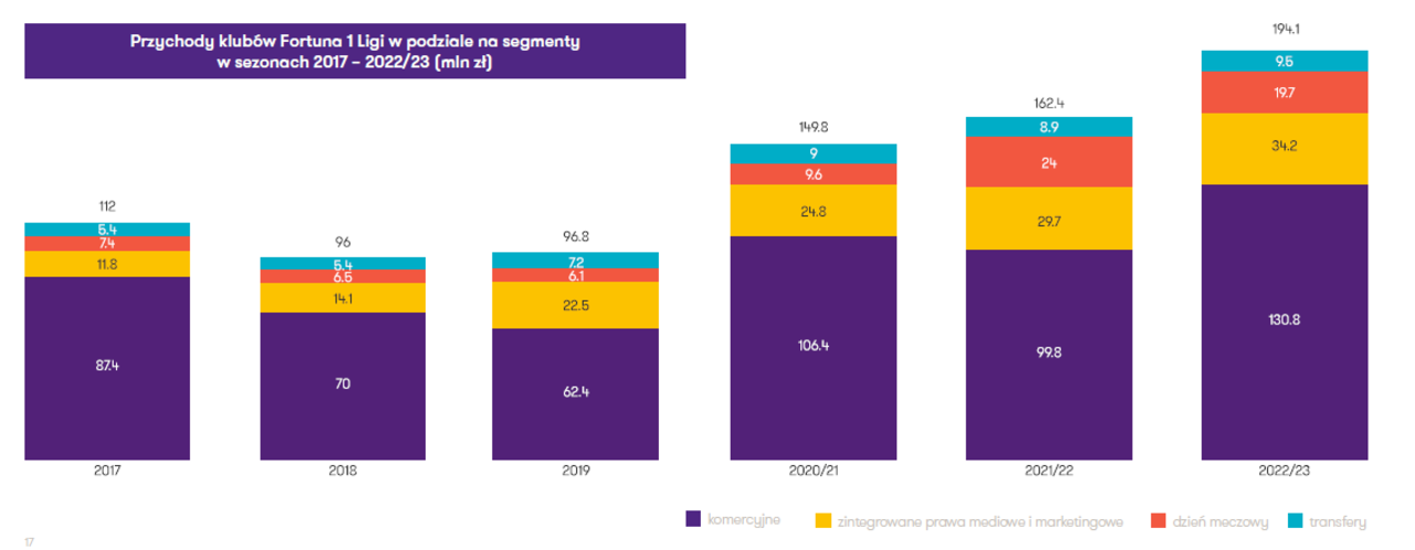 Raport "Finansowa pierwsza liga": 194 mln zł przychodów klubów F1L Wyniki finansowe klubów piłkarskich Fortuna 1 Ligi w sezonie 2022/2023. 25-10-2023 01:37 autor: informacja prasowa Miniony sezon był pod względem komercyjnym najlepszym w historii rozgrywek Fortuny 1 Ligi. Kluby odnotowały 194 mln zł przychodów, czyli najwięcej w historii - wynika z raportu „Finansowa pierwsza liga”, przygotowanego przez firmę audytorsko-doradczą Grant Thornton we współpracy z Pierwszą Ligą Piłkarską. Od kilku lat władze Fortuna 1 Ligi podsumowują raz w roku, jak kluby biorące udział w rozgrywkach rozwijają się pod względem biznesowym – jak zmieniają się ich przychody czy struktura kosztów. Od bieżącego roku raport pokazujący wyniki badania przygotowywany jest wspólnie z nowym partnerem, Grant Thornton, jedną z największych firm audytorsko-doradczych na świecie. Według raportu „Finansowa pierwsza liga”, w sezonie 2022/2023 przychody ogółem wszystkich klubów biorących udział w rozgrywkach Fortuna 1 Ligi wyniosły 194,1 mln zł (dane nie uwzględniają klubu Bruk-Bet Termalica Nieciecza, który nie zdecydował się udostępnić danych). To najwyższy wynik w historii, o 20% wyższy niż w sezonie poprzednim i o 102% więcej niż pięć lat temu. - Sezon 2022/2023 w Fortuna 1 Lidze trzymał kibiców w napięciu do samego końca. Do ostatniej kolejki kilka drużyn miało szansę na bezpośredni awans do PKO BP Ekstraklasy. Tego rodzaju emocje na boisku to esencja pracy wykonywanej w klubach, ale dla nas jako Pierwszej Ligi Piłkarskiej równie istotny jest rozwój biznesowy i wizerunkowy Fortuna 1 Ligi. Dlatego cieszymy się, że liga się rozwija, zarówno na poziomie klubów, które generują coraz wyższe przychody, jak i na poziomie centralnym, w którym widoczny jest rozwój rozgrywek jako produktu sportowego - komentuje Marcin Janicki, prezes zarządu Pierwszej Ligi Piłkarskiej. Największym źródłem przychodów klubów pierwszoligowych były – podobnie jak w poprzednich latach - tzw. przychody komercyjne, a więc przede wszystkim od sponsorów. W sezonie 2022/2023 wyniosły one 131 mln zł, czyli stanowiły 67,4% generowanych wpływów ogółem, a w porównaniu z sezonem 2021/2022 wzrosły o 31% (31 mln zł). Drugim największym segmentem przychodów były tzw. zintegrowane prawa mediowe i marketingowe, czyli wpływy wynikające z udziału klubu w Fortuna 1 Lidze (np. wpływy ze scentralizowanych umów dotyczących transmisji telewizyjnych czy sponsorów rozgrywek). Kluby otrzymały z tego tytułu w ostatnim sezonie 34,2 mln zł, czyli 17,6% przychodów ogółem, co oznacza wzrost o 15% (4,49 mln zł). Co ważne, na stadionach klubów Fortuna 1 Ligi dynamicznie rośnie również frekwencja. W minionym sezonie na trybunach zasiadło łącznie ponad milion kibiców, co średnio na każdy mecz daje 3,5 tys. osób, czyli o 25% więcej niż rok wcześniej. To efekt nie tylko rosnącej popularności rozgrywek wśród kibiców, ale też rozwoju stadionów i innej infrastruktury klubów. - To kolejny dobry rok dla polskiej piłki klubowej. Fortuna 1 Liga odnotowała w ostatnim roku wzrost większości kluczowych mierników obrazujących sytuację finansową i biznesową klubów - od frekwencji, przez przychody od sponsorów i innych partnerów czy przychody z transferów po przychody ogółem – wylicza Tomasz Mleczak, partner w zespole Corporate Finance w Grant Thornton. Choć Wisła Kraków nie zdołała awansować do PKO BP Ekstraklasy, to pod względem biznesowym krakowski klub miniony sezon mimo wszystko może zaliczyć do udanych. Osiągnął przychody ogółem na poziomie 35,9 mln zł, czyli zdecydowanie najwięcej ze wszystkich klubów ligi. Wysokimi przychodami mogą pochwalić się również beniaminek Stal Rzeszów (drugie miejsce w rankingu, z przychodami ogółem na poziomie 19,4 mln zł) oraz Podbeskidzie Bielsko-Biała (trzecie miejsce, 14,4 mln zł przychodów). - Wisła wygenerowała przychody, jakich mogłoby jej pozazdrościć nawet kilka klubów PKO BP Ekstraklasy. Wiele innych klubów Fortuna 1 Ligi również dobrze sobie radzi od strony biznesowej. W sezonie 2022/2023 tylko cztery odnotowały spadek przychodów w stosunku do poprzedniego sezonu - komentuje Marcin Diakonowicz, partner w Departamencie Audytu w Grant Thornton. Wyzwaniem sezonu 2022/2023 dla Fortuna 1 Ligi było utrzymanie wysokiej wartości mediowej całej ligi po awansie Widzewa Łódź do PKO BP Ekstraklasy. Tymczasem jak wskazują wyniki badań firmy Pentagon Research przedstawione w raporcie, wartość ekspozycji marek nie tylko nie zmniejszyła się, ale wręcz wyraźnie wzrosła – z 462,1 mln zł do 866,7 mln zł. Jest to zasługą przede wszystkim ciekawej walki klubów o awans do wyższej ligi, praktycznie do ostatnich minut, co przełożyło się na wysoką oglądalność meczów. - Podstawą budowania wartości dla sponsorów są dobre i emocjonujące mecze największych zespołów – wówczas logotypy marek, ich slogany, charakterystyczne kolory pokazują się w mediach o dużym zasięgu. Wpływ na wysoką wartość w sezonie 2022/2023 miała m.in. obecność w rozgrywkach Wisły Kraków. Pojawił się element ciekawości, jak Wisła poradzi sobie w niższej klasie rozgrywkowej – komentuje Adam Pawlukiewicz, research and development executive officer w Pentagon Research. Dobre wyniki sportowe i biznesowe klubów Fortuna 1 Ligi cieszą też sponsora tytularnego rozgrywek, firmę Fortuna. - Od 7 lat, czyli od momentu startu naszej współpracy z Pierwszą Ligą Piłkarską, jesteśmy bezpośrednim świadkiem ogromnego rozwoju organizacji na polu medialnym, biznesowym i marketingowym. Sponsoring Fortuna 1 Ligi dzięki zbudowanej już marce rozgrywek i obecności uznanych klubów to dziś gwarancja dotarcia do najbardziej zaangażowanej grupy fanów piłki nożnej, na których w naturalny sposób szczególnie nam zależy - uważa Konrad Komarczuk, prezes F