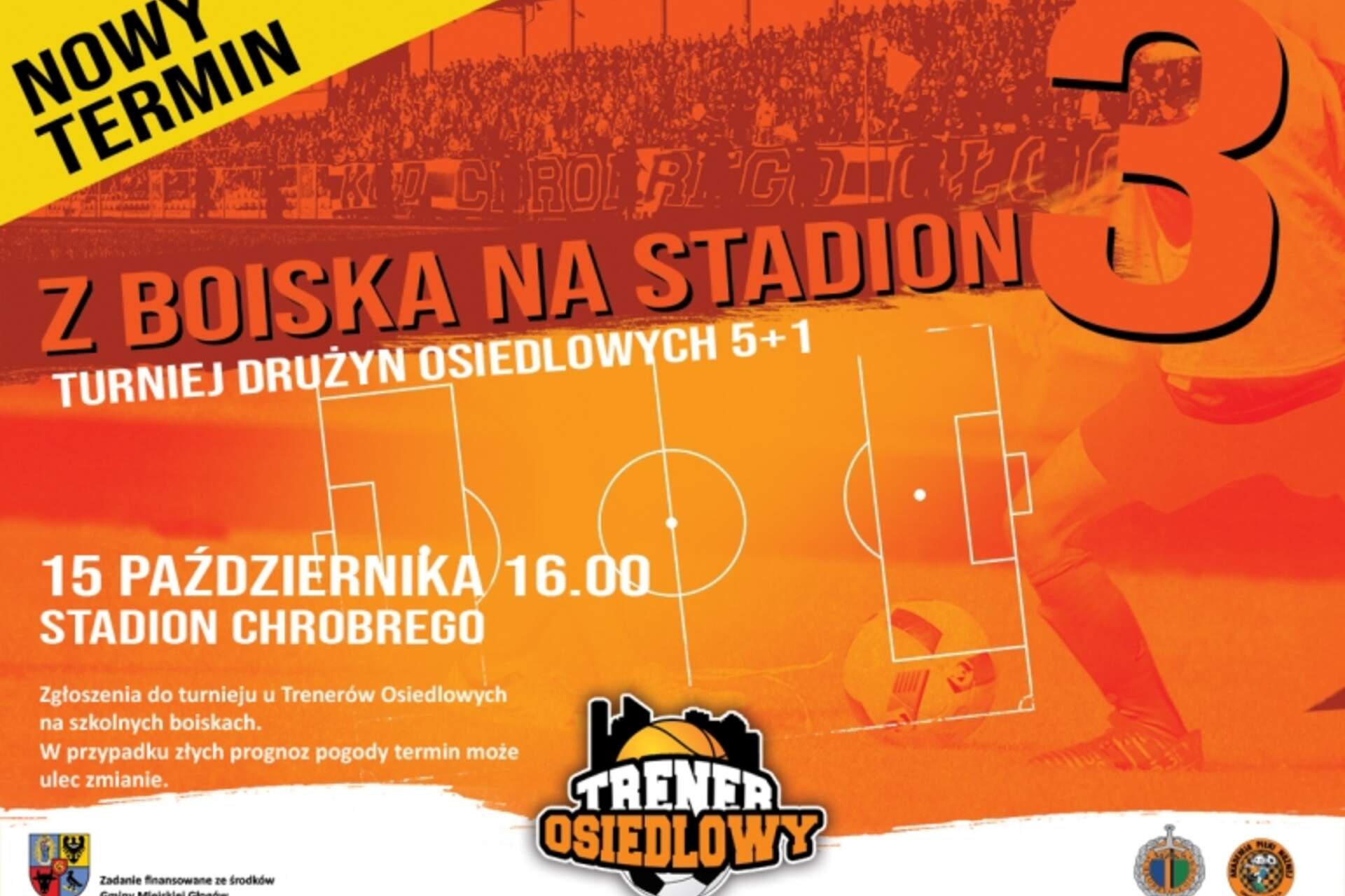Z Boiska na Stadion 15 października Z powodu prognozowanych na wtorek opadów deszczu, zgodnie z wcześniejszymi założeniami przenosimy turniej Z Boiska na Stadion 3 na kolejny wtorek. Nowym terminem jest 15 października z początkiem o godz. 16.00 na stadionie… 07-10-2019 10:34 autor: ŁJ Z powodu prognozowanych na wtorek opadów deszczu, zgodnie z wcześniejszymi założeniami przenosimy turniej Z Boiska na Stadion 3 na kolejny wtorek. Nowym terminem jest 15 października z początkiem o godz. 16.00 na stadionie Chrobrego.Turniej organizowany jest dla uczestników projektu Trener Osiedlowy. Przez kilka miesięcy mogli spotykać się na ośmiu przyszkolnych boiskach, na których grupa trenerów prowadzi bezpłatne zajęcia sportowe i rekreacyjne. Pierwszy etap podsumowała czerwcowa impreza sportowa zorganizowana na boisku przy SP 8, drugi i ostatni zostanie podsumowany turniejem Z Boiska na Stadion. Po nim już tylko kilkanaście dni wspólnych treningów.Do trzeciej edycji mogą przystąpić minimum sześcioosobowe drużyny z własną nazwą, które z zespołami utworzonymi na pozostałych boiskach będą rywalizować o miano najlepszej piłkarskiej w dwóch kategoriach. Na wszystkich uczestników czekają nagrody, poczęstunek i napoje.Informacje i zapisy na boiskach Trenera Osiedlowego. Sprawdź plan zajęć.
