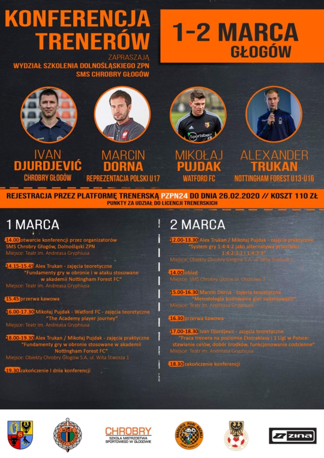 Zapraszamy na dwudniową konferencję trenerów Nasze miasto w dniach 1-2 marca będzie gospodarzem konferencji szkoleniowej dla trenerów chcących poszerzyć swoją wiedzą oraz uzyskać stosowne wymagania licencyjne. Warsztaty poprowadzą trenerzy Ivan Djurdjević, Marcin Dorna,… 17-02-2020 02:39 autor: ŁJ Nasze miasto w dniach 1-2 marca będzie gospodarzem konferencji szkoleniowej dla trenerów chcących poszerzyć swoją wiedzą oraz uzyskać stosowne wymagania licencyjne. Warsztaty poprowadzą trenerzy Ivan Djurdjević, Marcin Dorna, Mikołaj Pujdak i Alexander Trukan. Dwudniową konferencją organizują Wydział Szkolenia Dolnośląskiego ZPN, Dolnośląskie Stowarzyszenie Trenerów i Instruktorów Piłki Nożnej, SMS Chrobry Głogów, Chrobry Głogów i Gmina Miejska Głogów przy wsparciu marki Zina.Zajęcia będą prowadzone w Teatrze im. A. Gryphiusa oraz na obiektach Chrobrego. Udział jest płatny (110 zł), a ilość miejsc ograniczona do 250. Rejestracja uczestników odbywa się przez platformę trenerską PZPN 24 do 26 lutego.Odpłatność za szkolenie wynosi 110 zł z płatnością na konto:61 8669 0001 2020 0218 3776 0006z dopiskiem imię i nazwisko uczestnika, konferencja Głogów 1-2.03.2020.Osoby chcące otrzymać fakturę muszą w przelewie wpisać dane do faktury.Konferencja jest kończona uzyskaniem certyfikatu uczestnictwa na profilu trenerskim oraz zaliczeniem 6 godzin do przedłużenia licencji.1 marca14.00 otwarcie konferencji przez organizatorów SMS Chrobry Głogów, Dolnośląski ZPNMiejsce: Teatr im. Andreasa Gryphiusa14.15-15.45 Alex Trukan - zajęcia teoretyczne "Fundamenty gry w obronie i w ataku stosowane w akademii Nottingham Forest FC"Miejsce: Teatr im. Andreasa Gryphiusa15.45 przerwa kawowa16.00-17.30 Mikołaj Pujdak - Watford FC - zajęcia teoretyczne"The Academy player journey"Miejsce: Teatr im. Andreasa Gryphiusa18.00-19.30 Alex Trukan / Mikołaj Pujdak - zajęcia praktyczne "Fundamenty gry w obronie stosowane w akademii Nottingham Forest FC"Miejsce: Obiekty Chrobry Głogów S.A. ul. Wita Stwosza 119.30 zakończenie I dnia konferencji2 MARCA12.00-13.30 Alex Trukan / Mikołaj Pujdak - zajęcia praktyczne"System gry 1:4:4:2 jako alternatywa przeciwko 1:4:2:3:1 i 1:4:3:3"Miejsce: Obiekty Chrobry Głogów S.A. ul. Wita Stwosza 114.00 obiad Miejsce: SMS Chrobry Głoów ul. Obozowa 315.00-16.30 Marcin Dorna - zajęcia teoretyczne"Metodologia budowania gier zadaniowych"Miejsce: Teatr im. Andreasa Gryphiusa16.30 przerwa kawowa17.00-18.30 Ivan Djurdjević - zajęcia teoretyczne"Praca trenera na poziomie Ekstraklasy i 1 Ligi w Polsce: stawianie celów, dobór środków, funkcjonowanie codzienne"Miejsce: Teatr im. Andreasa Gryphiusa18.30 zakończenie konferencji