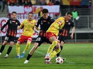 Chrobry zwycięski po raz ósmy! Chrobry wraca na zwycięską ścieżkę. Bramki Kacpra Laskowskiego w 63. i Piotra Janczukowicza w 90. minucie zapewniły wygraną w Pruszkowie 2:0. 07-11-2025 10:16 autor: ŁJ W tym meczu to Znicz zaczął odważnie - już w pierwszych dziesięciu minutach stworzył dwie groźne sytuacje. Na bramkę uderzali Radosław Majewski i Daniel Bąk, zmuszając Dawida Arndta do interwencji. Gospodarze mogli żałować zwłaszcza tej drugiej szansy, bo po niej piłka odbiła się od słupka. Chrobry przed swoją okazją stanął w 29. minucie. Najpierw próbował strzelać Kacper Nowakowski, ale został przyblokowany. Przytomnie zachował się przy tym Kacper Laskowski, który mógł poprawić dobitką, jednak uderzona przez niego futbolówka przeszła obok słupka. Po 45 minutach mieliśmy więc kilka okazji, ale żadna nie została zamieniona na gola i obie ekipy udały się do szatni przy bezbramkowym remisie. Druga połowa początkowo również lepiej układała się gospodarzom, którzy byli blisko objęcia prowadzenia po rzucie rożnym i główce Jarosława Jecha - na szczęście niecelnej. Pomarańczowo-czarni odważniej ruszyli w 63. minucie. Znów akcję kończyli Kacper Nowakowski z Kacprem Laskowskim. Ten drugi zdecydował się na strzał z dystansu - i to była bardzo dobra decyzja, bo po nim piłka w efektowny sposób zatrzepotała w siatce. W ten sposób Kacper po raz czwarty w tym sezonie wpisal się na listę strzelców. Ta bramka wyraźnie uspokoiła poczynania Chrobrego, który do samego końca w dosyć pewny sposób dowiózł trzy punkty. Znicz co prawda atakował, jednak nie trafiał w światło bramki. Za to w samej końcówce zrobił to zespół trenera Łukasza Becelli, a konkretnie wprowadzony w tej części gry i kończący dogranie Kacpra Laskowskiego Piotr Janczukowicz, tym samym będący autorem 700. bramki Chrobrego na pierwszoligowym poziomie. Ósma wygrana głogowian i szóste czyste konto stały się więc faktem. Zwycięstwo w Pruszkowie pozwoli w dobrych nastrojach przepracować dwutygodniową przerwę reprezentacyjną, która rozpocznie się po weekendowej kolejce. Chrobry na kolejny występ poczeka do 22 listopada - wtedy podejmie u siebie Wieczystą Kraków. fot. 400mm.pl