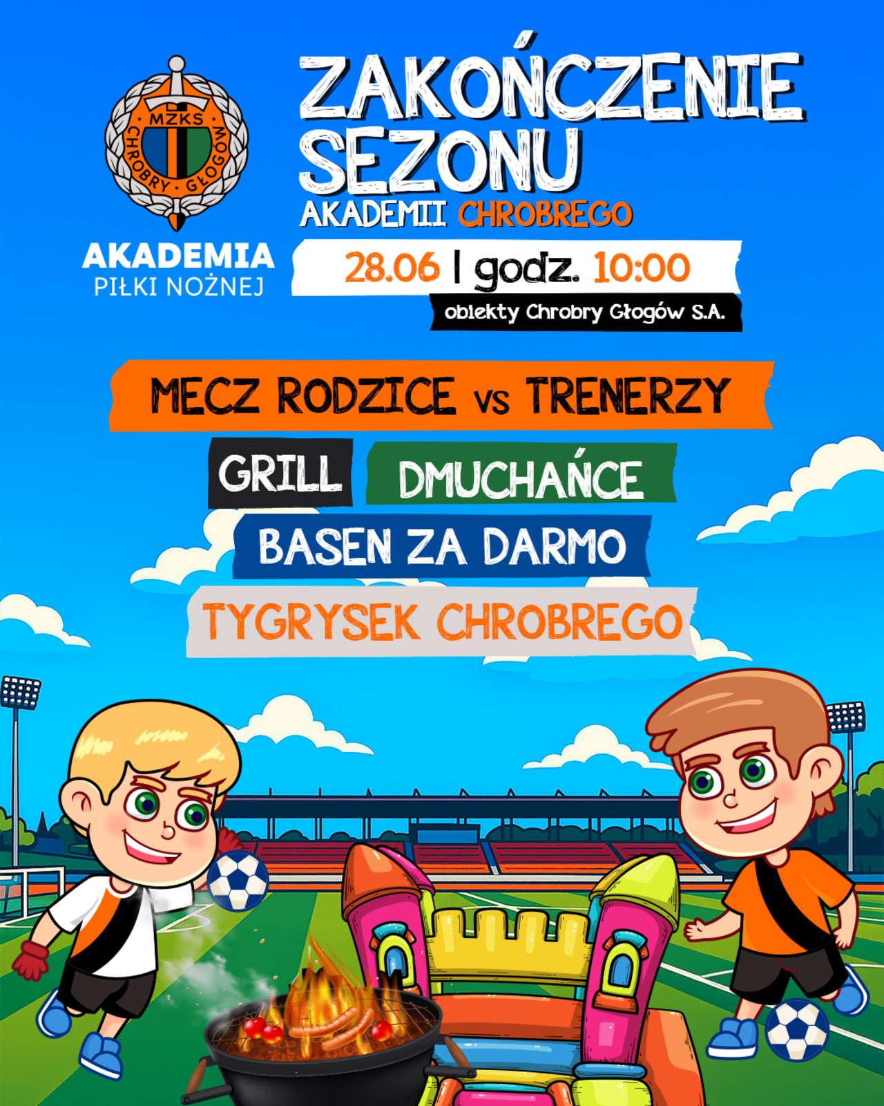 Wielkie zakończenie sezonu Akademii! Dobiega koniec kolejnego sezonu w Akademii Piłki Nożnej Chrobrego Głogów. Zachęcamy do jego wspólnego świętowania – w sobotę 28 czerwca na obiektach klubu. 20-06-2025 01:56 autor: ŁJ Zaczynamy na pierwszej płycie stadionu o godz. 10.00. - Zapraszamy wszystkich zawodników i zawodniczki Akademii Piłki Nożnej Chrobrego, a także rodziców i trenerów. Chcemy wspólnie, aktywnie spędzić czas i podsumować upływający sezon. Nadrzędnym celem naszego spotkania jest integracja środowiska zawodników, zawodniczek, rodziców i trenerów klubowej Akademii - zaprasza dyrektor APN Jarosław Wielgus. Na program wydarzenia składa się mnóstwo atrakcji. Tego dnia odbędzie się jedyny w swoim rodzaju mecz towarzyski rodziców na trenerów. Po głośnym dopingu zapraszamy na dmuchańce, na baseny odkryte, które wszystkim uczestnikom zostaną udostępnione za darmo i na poczęstunek, bo skoro prawdziwie letni piknik, to nie może zabraknąć pysznych potraw z grilla i wojskowej grochówki. Czas wypełnią też treningi, choć tego dnia liczy się przede wszystkim dobra zabawa. Podczas zakończenia tętnił życiem będzie nie tylko stadion z basenami, ale też inne boiska treningowe. Na nich odbędzie się inauguracyjna kolejka Ligi Orlikowej, której będziemy patronować, oraz zajęcia Trenera Osiedlowego. - W ten sposób chcemy zaprosić zawodników i zawodniczki do udziału w prowadzonym przez klub projekcie Trenera Osiedlowego oraz w głogowskiej Lidze Orlikowej. To świetna okazja na aktywne spędzenie wakacji, bo oba przedsięwzięcia będą prowadzone przez całe lato - dodaje Jarosław Wielgus.