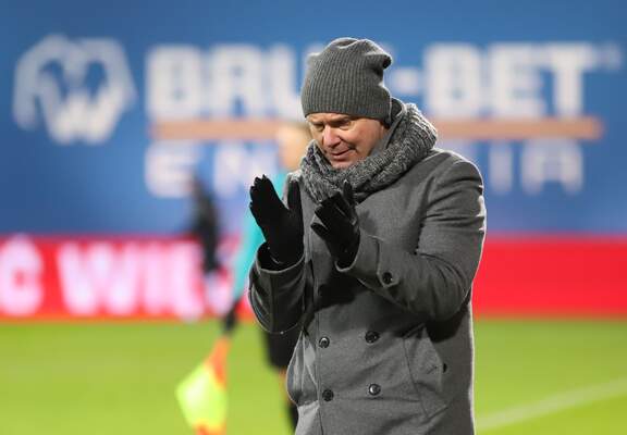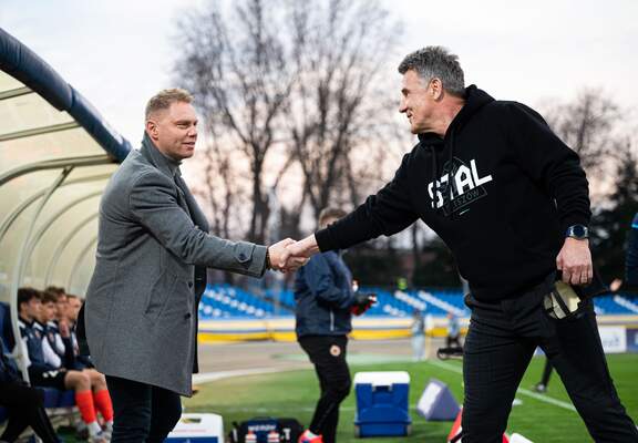 Trenerzy Łukasz Becella i Marcin Brosz po kończącym rok meczu w Niecieczy.