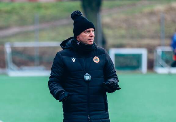 Trener Łukasz Becella po sparingu ze Świtem Szczecin.