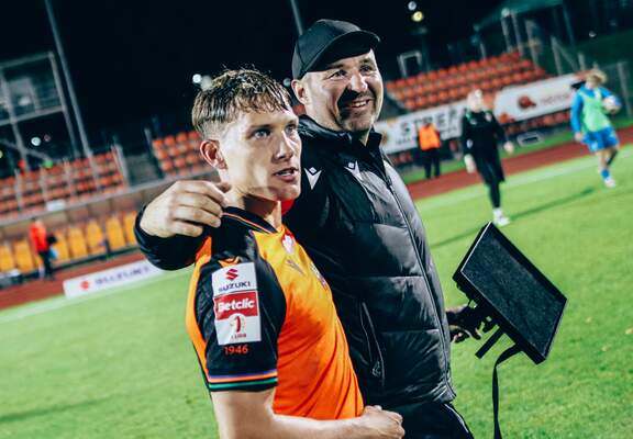 Trenerzy Łukasz Becella i Ante Simundza po meczu Chrobrego ze Śląskiem.