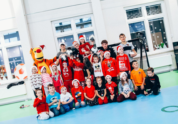 Mikołajkowa lekcja WF z piłkarzami i klubową maskotką