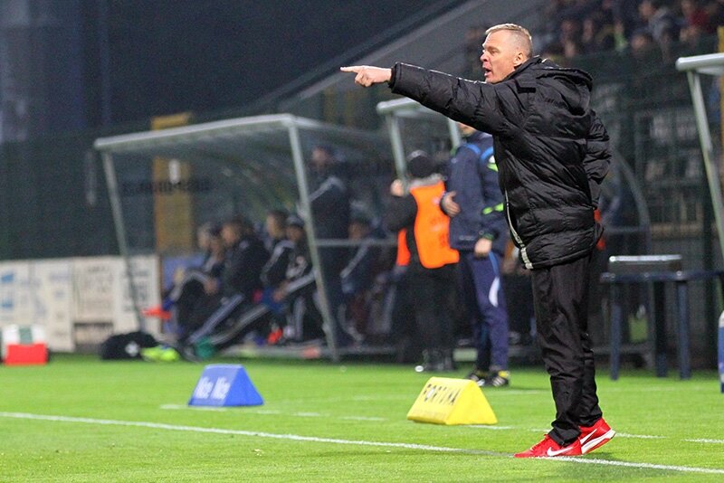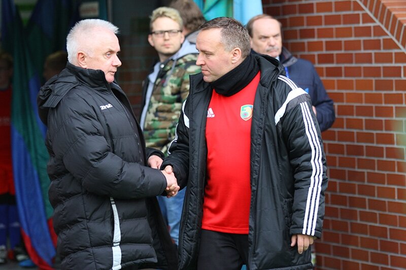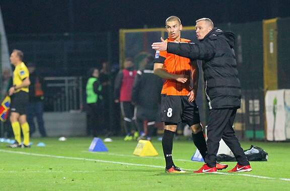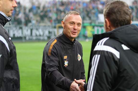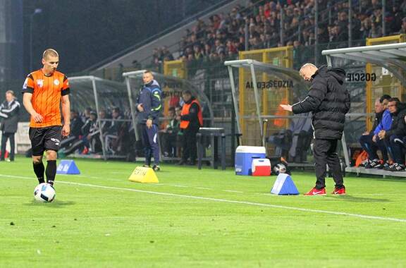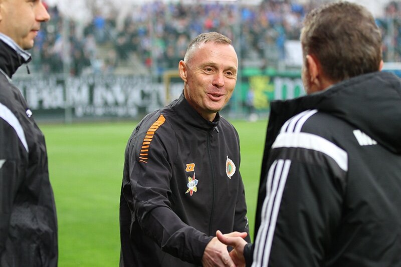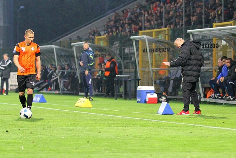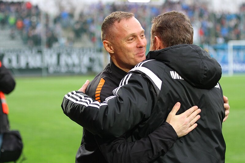 Trenerzy Łukasz Becella i Piotr Stokowiec po Chrobry - Pogoń.