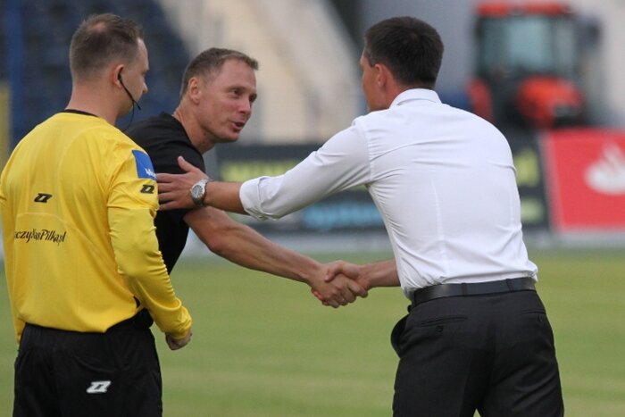 Trenerzy Łukasz Becella i Piotr Stokowiec po Chrobry - Pogoń.
