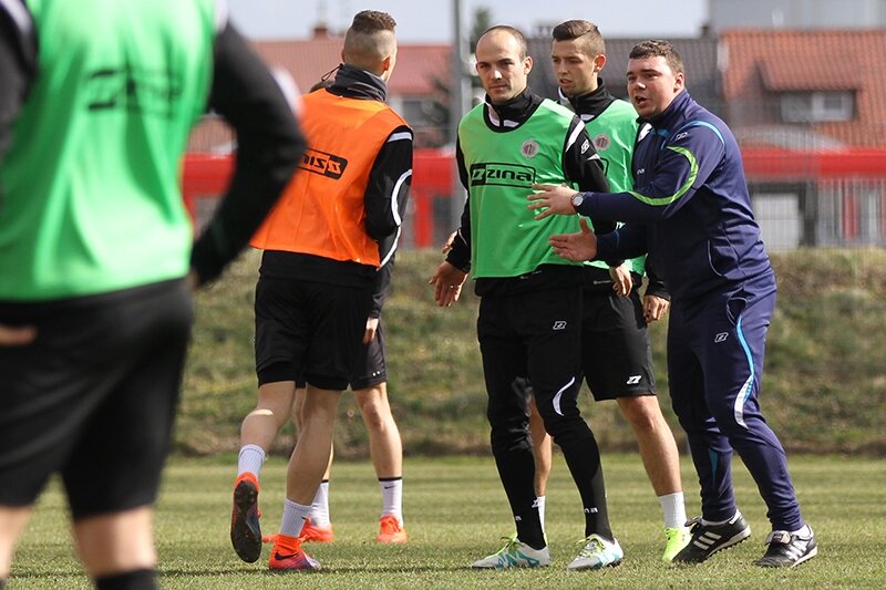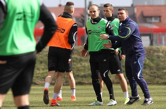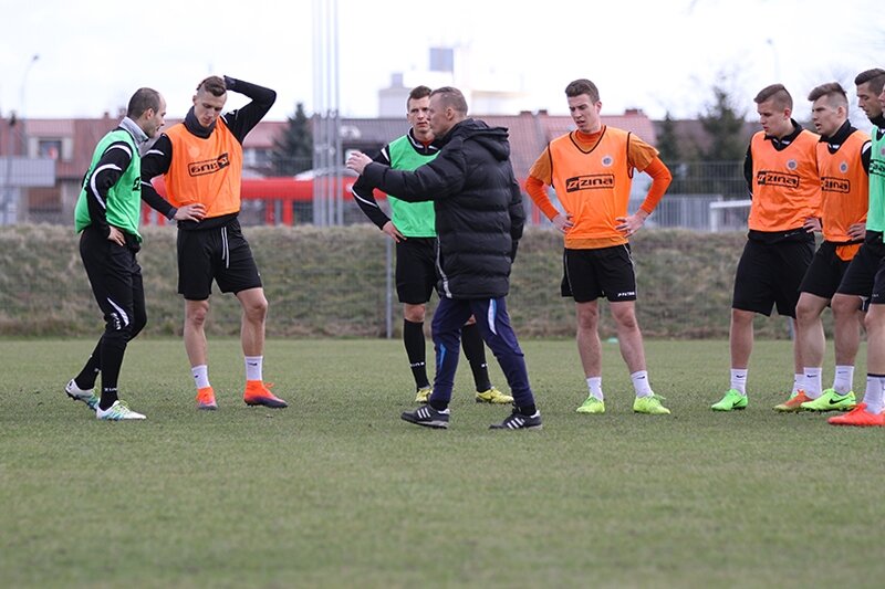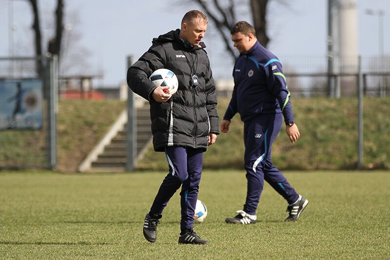 Trenerzy Łukasz Becella i Piotr Stokowiec po Chrobry - Pogoń.