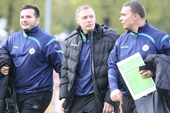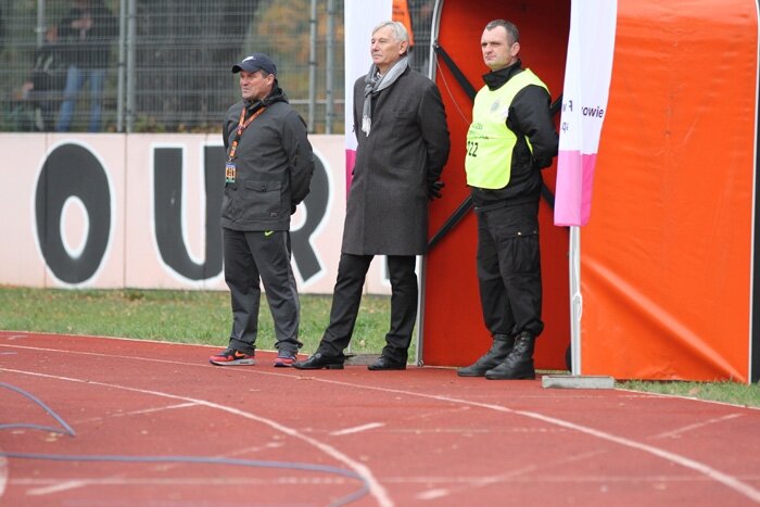 Trenerzy Łukasz Becella i Piotr Stokowiec po Chrobry - Pogoń.