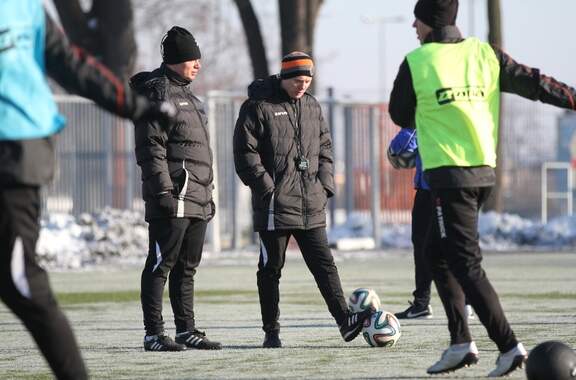 Trenerzy Łukasz Becella i Piotr Stokowiec po Chrobry - Pogoń.