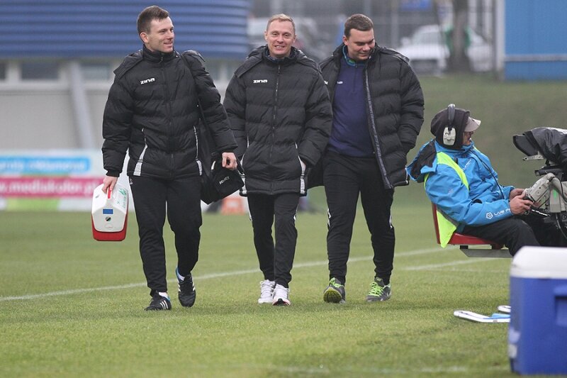 Trenerzy Łukasz Becella i Piotr Stokowiec po Chrobry - Pogoń.