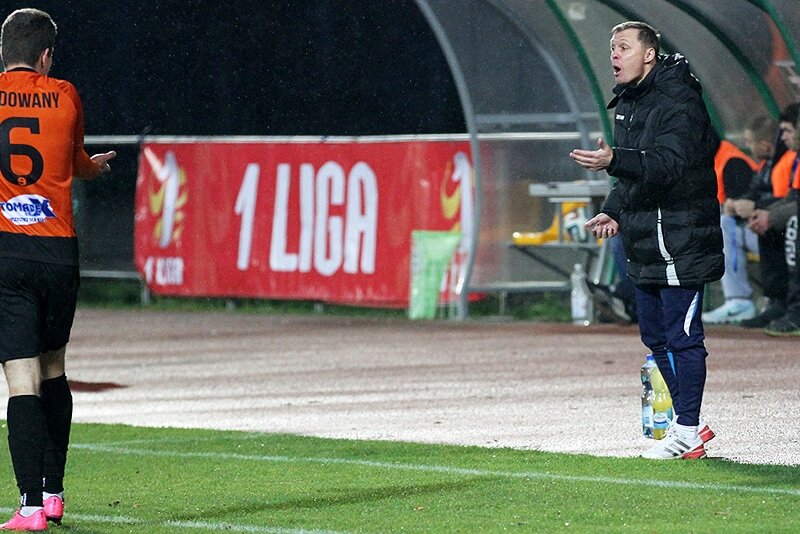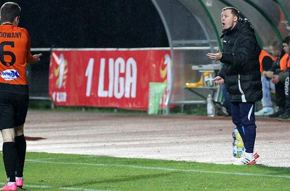 Trenerzy Łukasz Becella i Piotr Stokowiec po Chrobry - Pogoń.