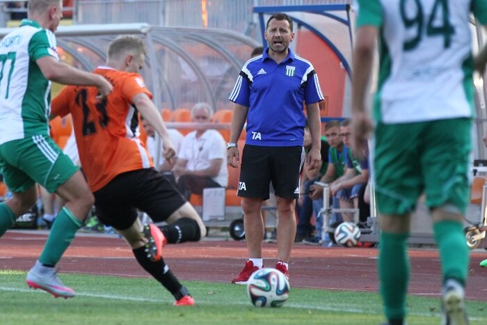 Trenerzy Łukasz Becella i Piotr Stokowiec po Chrobry - Pogoń.