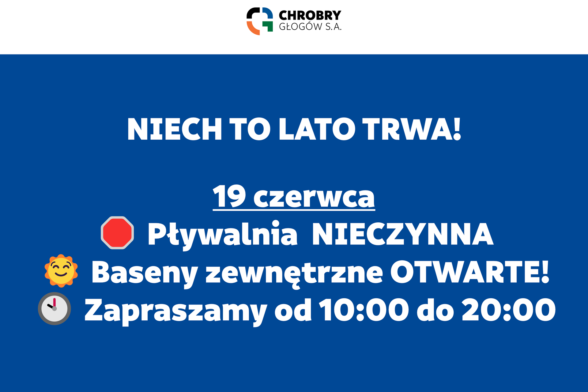 Informacja o funkcjonowaniu obiektów 19 czerwca 2025 13-06-2025 02:59 autor: BK Uprzejmie informujemy, że w czwartek 19 czerwca 2025 r. Pływalnia Chrobry Głogów S.A. będzie nieczynna. Jednocześnie zapraszamy do skorzystania z Basenów Zewnętrznych, które w tym dniu będą otwarte w standardowych godzinach – od 10:00 do 20:00. To doskonała okazja, by spędzić czas aktywnie na świeżym powietrzu i skorzystać z atrakcji przygotowanych na terenie naszego kompleksu letniego. Dziękujemy za wyrozumiałość i do zobaczenia na basenach odkrytych!