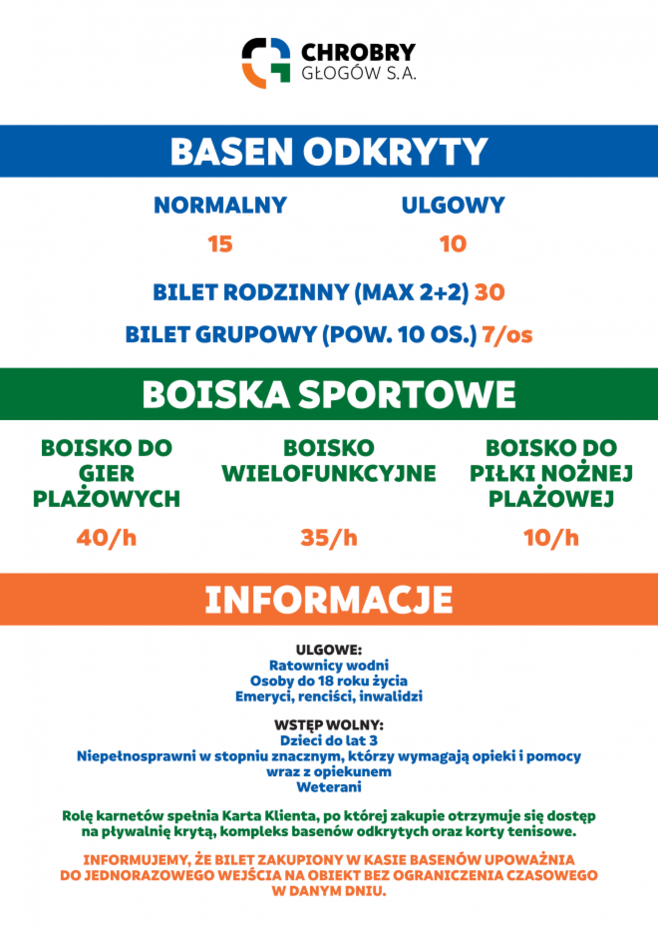 Baseny odkryte od 1 lipca W środę, 1 lipca rozpoczyna się sezon na aktywne spędzanie czasu na terenie kompleksu basenów odkrytych Chrobry Głogów S.A.Obiekt będzie czynny codziennie od 10:00 do 20:00.W zakresie przeciwdziałania COVID19 stosujemy… 29-06-2020 04:16 autor: MK W środę, 1 lipca rozpoczyna się sezon na aktywne spędzanie czasu na terenie kompleksu basenów odkrytych Chrobry Głogów S.A.Obiekt będzie czynny codziennie od 10:00 do 20:00.W zakresie przeciwdziałania COVID19 stosujemy następujące zasady:1) maksymalna ilość gości jednocześnie: 800,2) należy zachować dystans 2m od innych osób,3) z jednego toru basenu sportowego może jednocześnie korzystać do 4 osób.4) przy kasie należy zasłonić usta i nos.Zasada dystansu społecznego oraz ograniczenia ilościowe na torze pływackim nie dotyczą rodzin oraz osób wspólnie zamieszkujących w gospodarstwie domowym.Na terenie kompleksu będzie można korzystać z pełnej oferty: basenów, zjeżdżalni, placu zabaw, boisk sportowych i baru.Bilety całodniowe:- normalny - 15zł- ulgowy - 10zł- rodzinny (max. 2+2) - 30zł