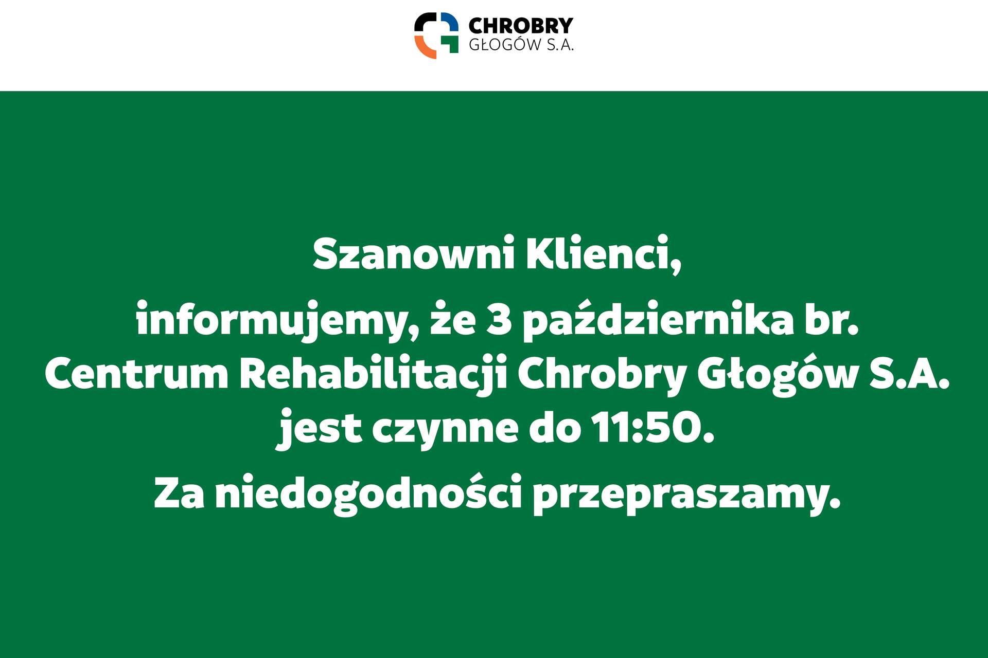 3 października pracujemy krócej! 03-10-2025 08:14 autor: Szanowni Klienci, informujemy, że dziś (tj. 3 października 2025), Centrum Rehabilitacji Chrobry Głogów S.A., jest czynne do Waszej dyspozycji do godziny 11:50. Za niedogodności przepraszamy! Zespół CRO
