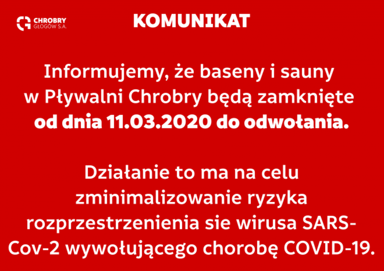 Pływalnia i sauny nieczynne do odwołania Informujemy, że baseny i sauny w Pływalni Chrobry pozostaną zamknięte do odwołania. 12-03-2020 01:18 autor: Chrobry Głogów S.A. Informujemy, że baseny i sauny w Pływalni Chrobry pozostaną zamknięte do odwołania.