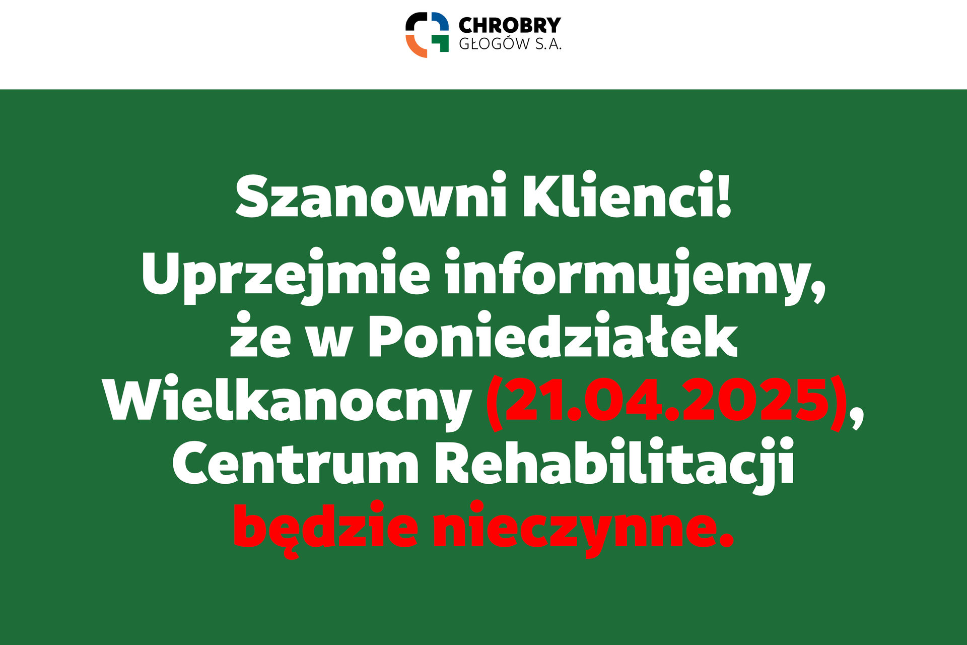 Sprawdź jak pracujemy w czasie świąt w Centrum Rehabilitacji 16-04-2025 11:17 autor: BK 🔹 18 kwietnia (czwartek) – pracujemy do godziny 14:30 🔹 21 kwietnia (niedziela) – Centrum Rehabilitacji Chrobry Głogów będzie nieczynne ze względu na Święta Wielkanocne Prosimy o uwzględnienie zmian przy planowaniu wizyt. W razie pytań – jesteśmy dostępni pod numerem: 📞 504 274 097