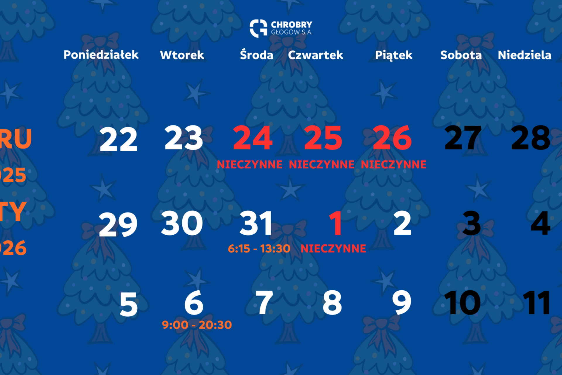 Godziny otwarcia Pływalni Chrobry Głogów w okresie świąteczno-noworocznym 08-12-2025 02:16 autor: BK Szanowni Klienci, informujemy o zmianach w funkcjonowaniu Pływalni Chrobry Głogów w przerwie świątecznej: 23 grudnia (poniedziałek) – czynne zgodnie ze standardowym harmonogramem 24–26 grudnia (środa, czwartek, piątek) – obiekt nieczynny 27–28 grudnia (sobota, niedziela) – czynne według weekendowego harmonogramu 29–30 grudnia (poniedziałek, wtorek) – czynne według weekendowego harmonogramu 31 grudnia (środa) – czynne w godz. 6:15–13:30 (ostatnie wejście na basen o 12:30) 1 stycznia (czwartek) – obiekt nieczynny 6 stycznia (wtorek) – czynne w godz. 9:00–20:30 7 stycznia (środa) – powrót do standardowego harmonogramu Dziękujemy za zrozumienie i zapraszamy do korzystania z naszych usług w okresie świątecznym oraz noworocznym.