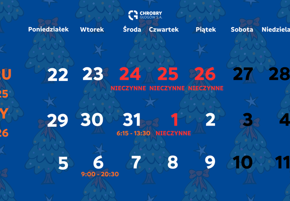 Harmonogram pracy Centrum Rehabilitacji Chrobry Głogów w okresie Świąt Bożego Narodzenia i Nowego Roku 12-12-2025 10:35 autor: BK Szanowni Państwo,w związku ze zbliżającym się okresem świąteczno–noworocznym informujemy o zmianach w godzinach funkcjonowania naszego Centrum Rehabilitacji: 📆 22–23 grudniaCRO pracuje w godzinach 7:00–14:35. ❌ 24–26 grudniaW tych dniach CRO będzie nieczynne — to czas przeznaczony na świąteczny odpoczynek z najbliższymi. 📆 29–30 grudniaJesteśmy do Państwa dyspozycji w godzinach 7:00–14:35. 📆 31 grudniaJesteśmy do Państwa dyspozycji w godzinach 7:00–14:00. ❌ 1–6 styczniaCRO pozostaje nieczynne. 📣 Od 7 styczniaWracamy do pracy i widzimy się ponownie w pełnym składzie.