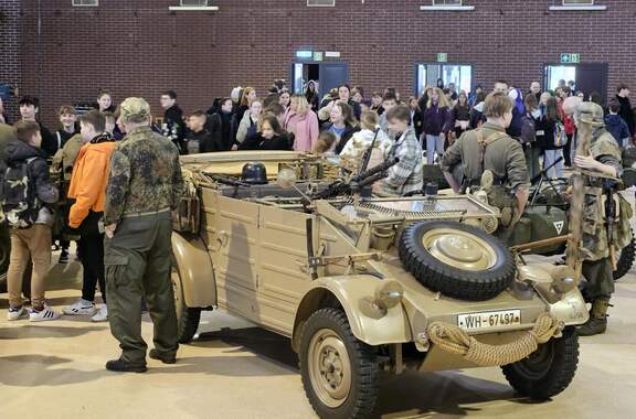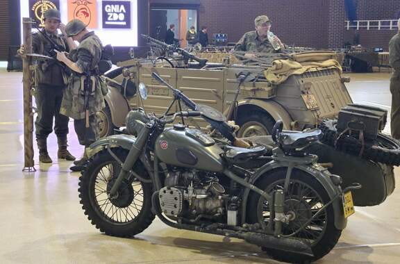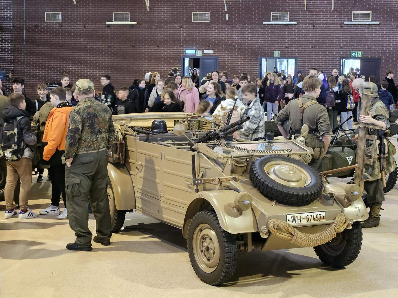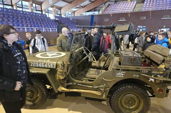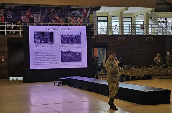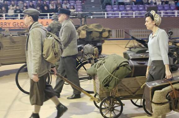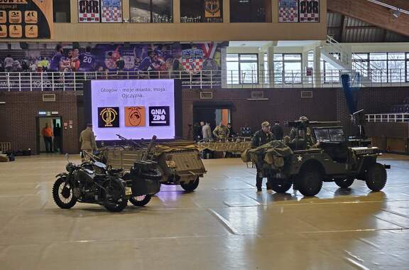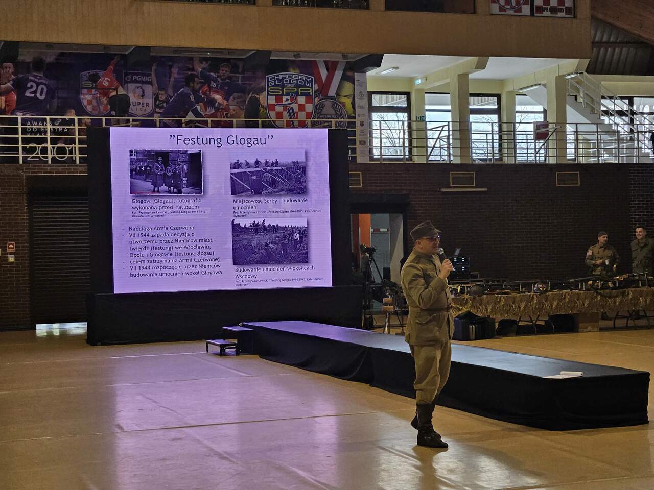 Interaktywna lekcja historii Głogowa W Hali WIdowiskowo-Sportowej im. Matuszaka odbyła się przygotowana specjalnie dla uczniów Szkół Podstawowych interaktywna lekcja historii. 31-03-2023 11:31 autor: MK / MK / zdjęcia: MK Hala Widowiskowo-Sportowa im. Matuszaka gościła niesamowitą lekcję historii. "Głogów — moje miasto, moja ojczyzna". Wzięli w niej udział uczniowie Głogowskich szkół podstawowych. Poznali historię swojego miasta od upadku Festung Glogau, aż do dzisiaj. Po wykładzie zapoznali się z pamiątkami wojennymi. Lekcja odbyła się w ramach I Głogowskiego Festiwalu Historycznego. Lekcja rozpoczęła się od pokazu mody, który przedstawił zmiany w modzie oraz pomysłowość mieszkańców zniszczonych przez wojnę miast. Był płaszcz z koca, była sukienka ze spadochronu, sukienka z zasłon czy buty z drewna. Kolejnym punktem był wykład o trudnej, naznaczonej wieloma tragediami historii powojennego Głogowa. O zmianie granic Polski, która wpłynęła na wędrówkę ludzi ze wschodu na zachód. O pierwszych osadnikach. O pierwszym burmistrzu. Cały wykład ubarwiony był zdjęciami i wspomnieniami byłych i nowych mieszkańców zniszczonego w 85% miasta. Po teorii przyszła pora na praktykę. Uczniowie mieli możliwość obcować z bronią, pojazdami, historykami, którzy przybliżali czasy już dawno minione, a które są widoczne do dziś. Kolejne punkty I Głogowskiego Festiwalu Historycznego w sobotę 01.04.