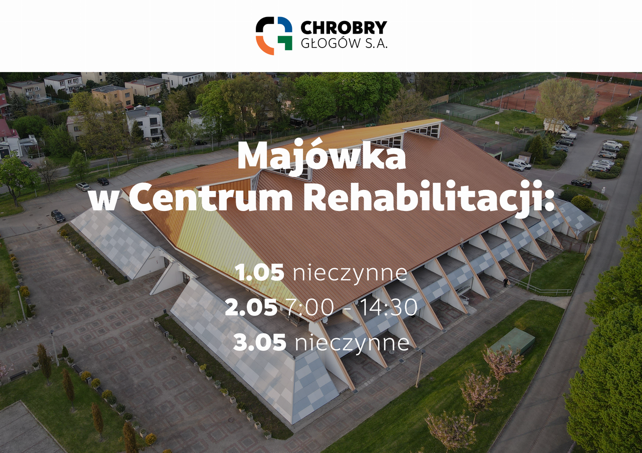 Majówkowy harmonogram Centrum Rehabilitacji Sprawdź, jak w majówkę czynne będzie Centrum Rehabilitacji! 24-04-2023 12:22 autor: MK / MD / zdjęcia: MS W trakcie Majówki Centrum Rehabilitacji będzie czynne w następujących godzinach: 1.05 - nieczynne 2.05 - 7:00 - 14:30 3.05 - nieczynne