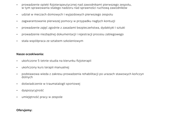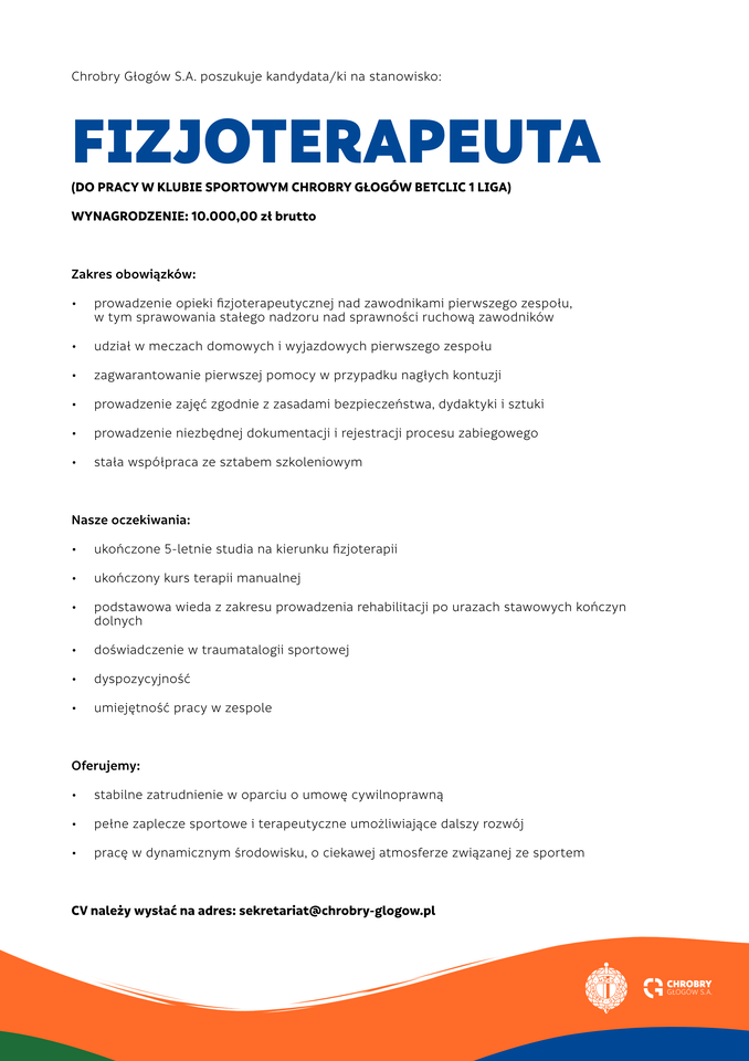 Oferta pracy: Fizjoterapeuta I Zespołu Chrobry Głogów S.A. poszukuje fizjoterapeuty do pracy przy występującym w 1 lidze zespole piłkarskim. 25-06-2025 11:56 autor: BK