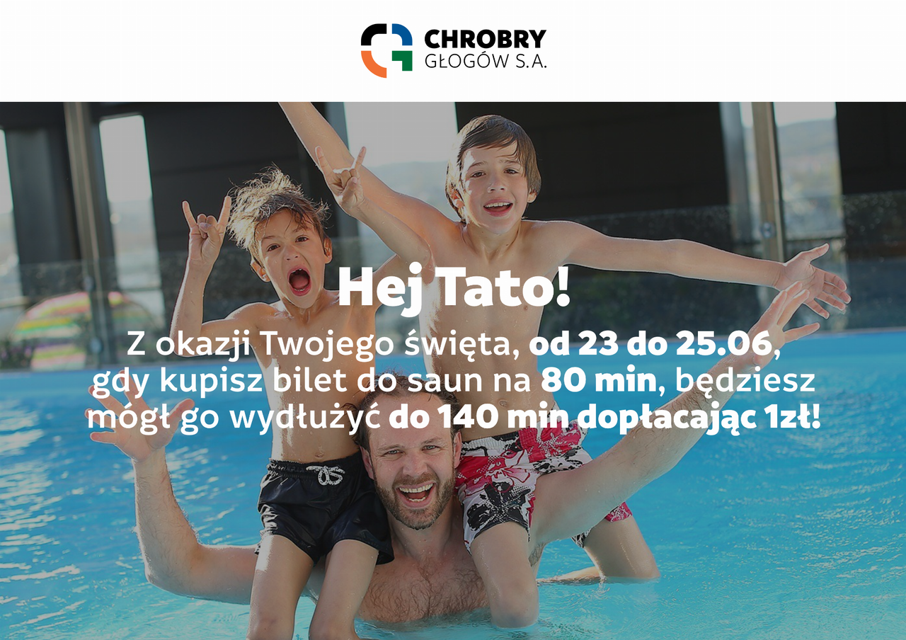 Zrelaksuj się w saunie Tato! Chrobry Głogów wprowadza promocję na Dzień Ojca w Strefie Saun! 21-06-2023 09:50 autor: MK / MK / zdjęcia: MS Dla wszystkich Ojców, aby uczcić ich święto, Chrobry Głogów wprowadza promocję w Strefie Saun. Od 23 do 25 czerwca panowie, którzy kupią bilet Basen+Sauna na 80 minut za 32 zł mogą wydłużyć swój czas w saunach do 140 minut za 1 zł! Wtedy 140-minutowy bilet Basen+Sauna będzie kosztował łącznie 33 zł. Z promocji mogą skorzystać tylko pełnoletni panowie.