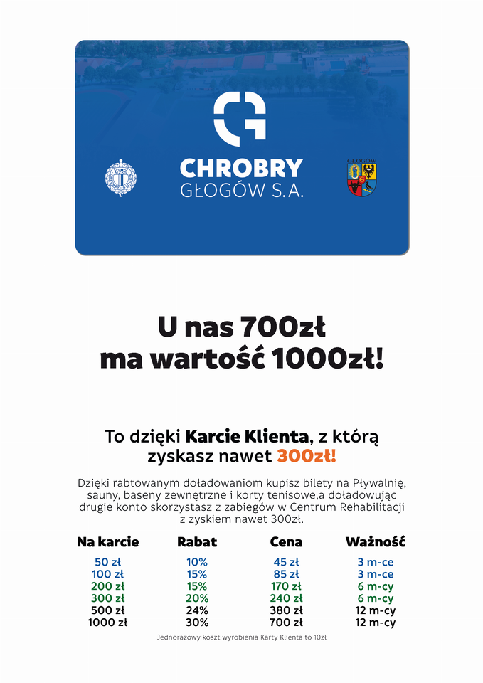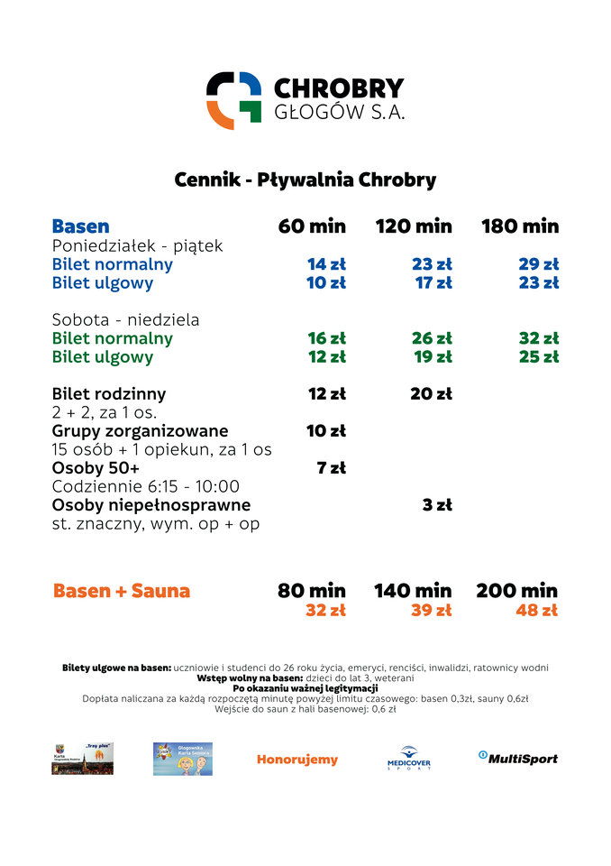 Zmiana cen w Pływalni Chrobry i Strefie Saun Od 01.03.2023 Chrobry Głogów zmienia ceny biletów w Pływalni Chrobry. Sprawdź, ile od marca będzie kosztować wstęp na baseny o do saun. 27-02-2023 07:00 autor: mk / mk / zdjęcia: mk Od 1 marca 2023 Chrobry Głogów zmienia ceny biletów w Pływalni Chrobry. Nowe stawki będą obowiązywać za wstęp na baseny oraz do saun. Zmiana dotknie też cen wstępu dla osób 50+ oraz osób z niepełnosprawnościami. Do użytku klientów zostaje Karta Klienta Chrobrego, dzięki której osoba, która ją posiada, zyskuje do 300 zł na korzystaniu z obiektów Chrobrego. Można ją wyrobić w kasach Pływalni.