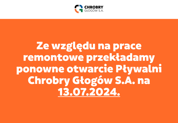 Z powodu remontu Pływalnia Chrobry Głogów jest nieczynna dla klientów. Termin ponownego otwa...