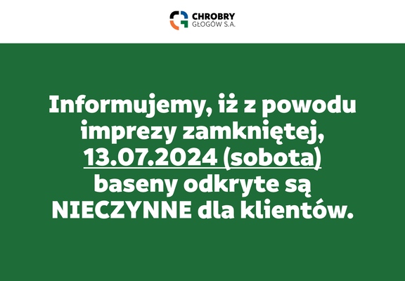 Tego dnia na terenie Pływalni Chrobry Głogów S.A. odbywa się impreza zamknięta.
