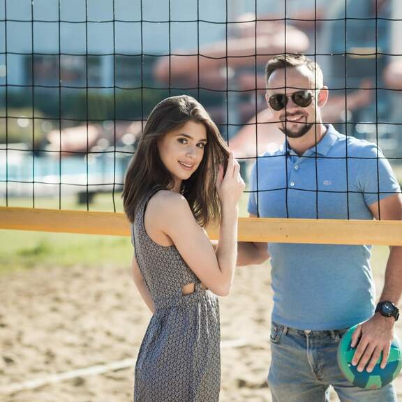 Grasz ze znajomymi w siatkówkę plażową, opalasz się i pływasz,